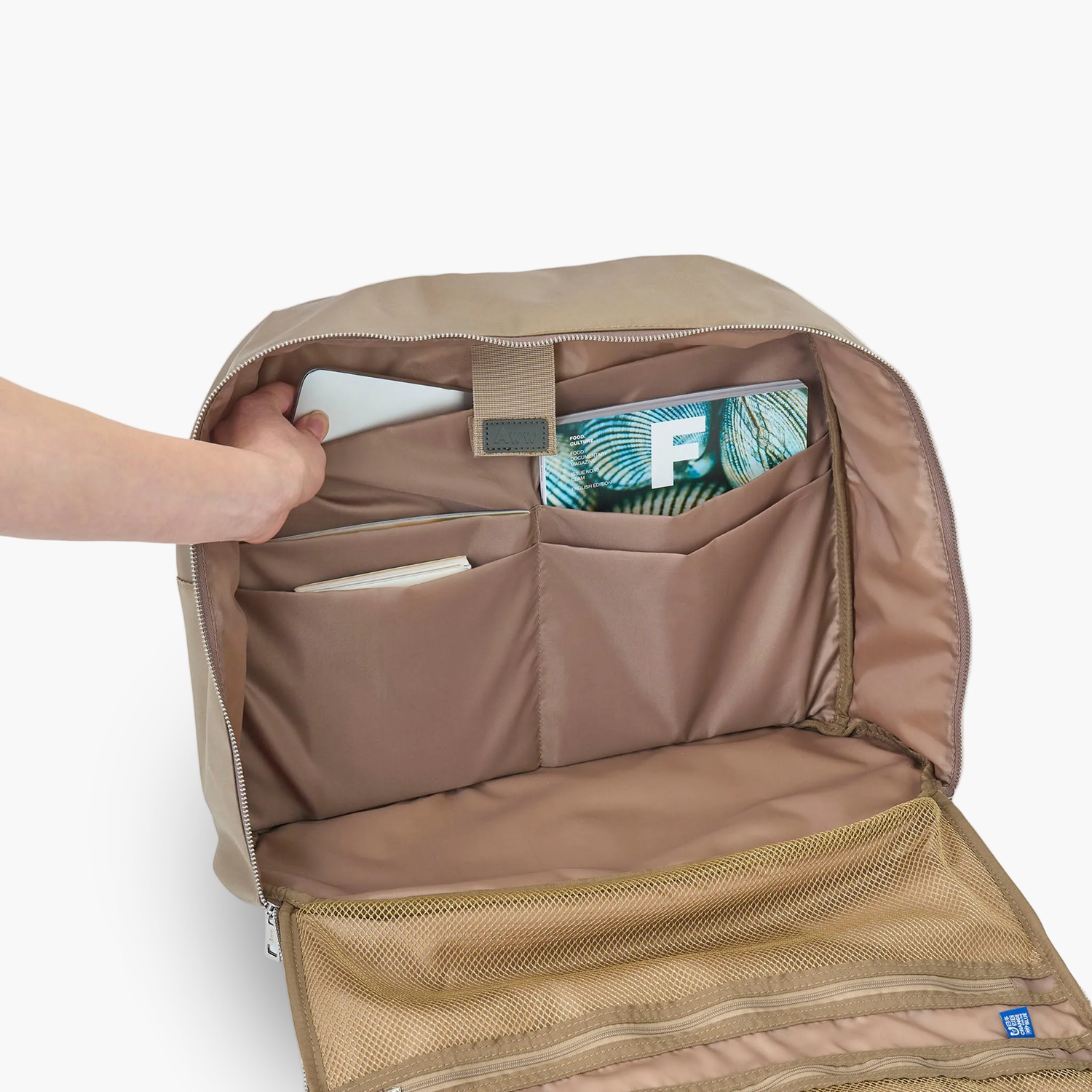 フロントのメッシュポケットに加え、16インチPC収納ポケットなど、サイズの異なる多彩なコンパートメントを完備しています。