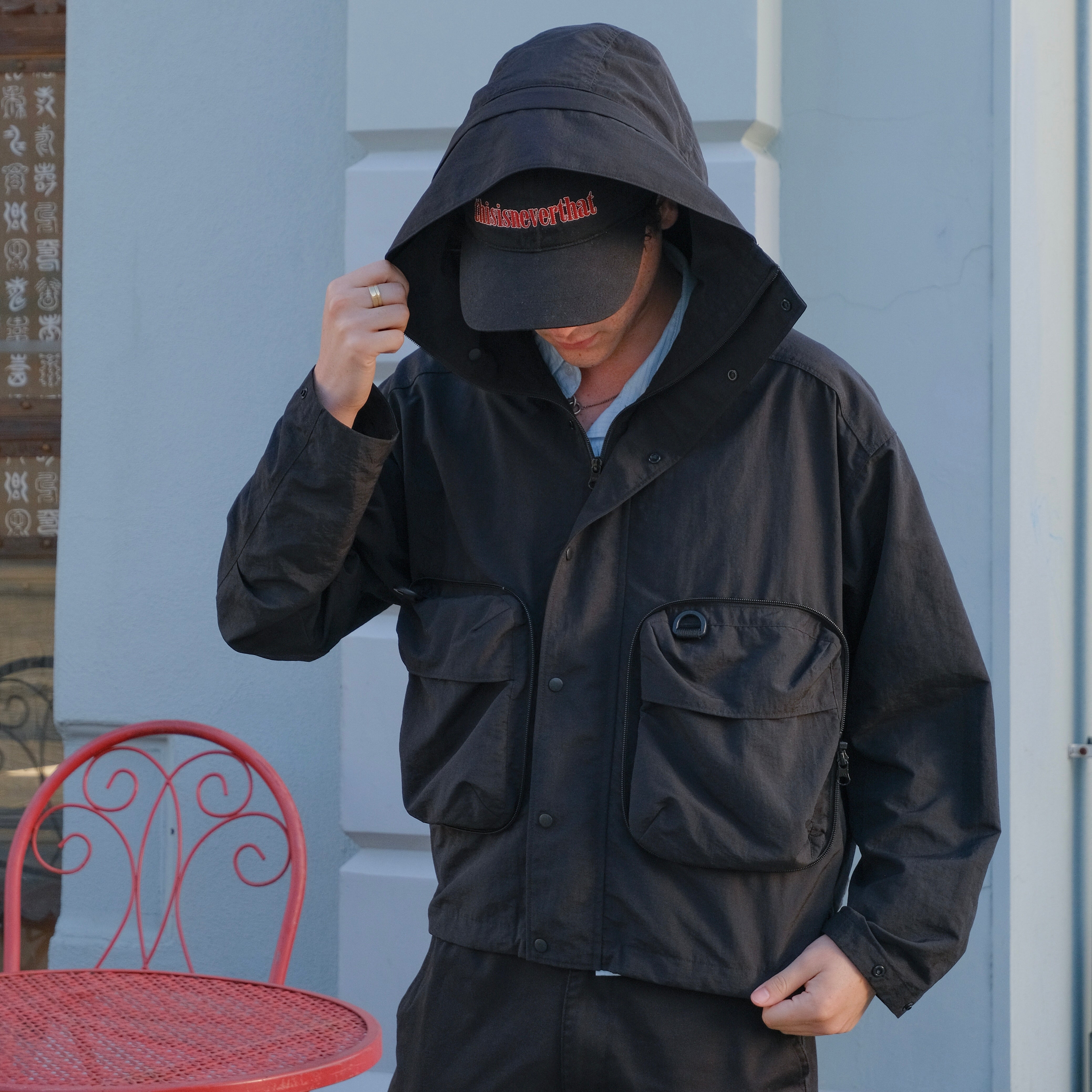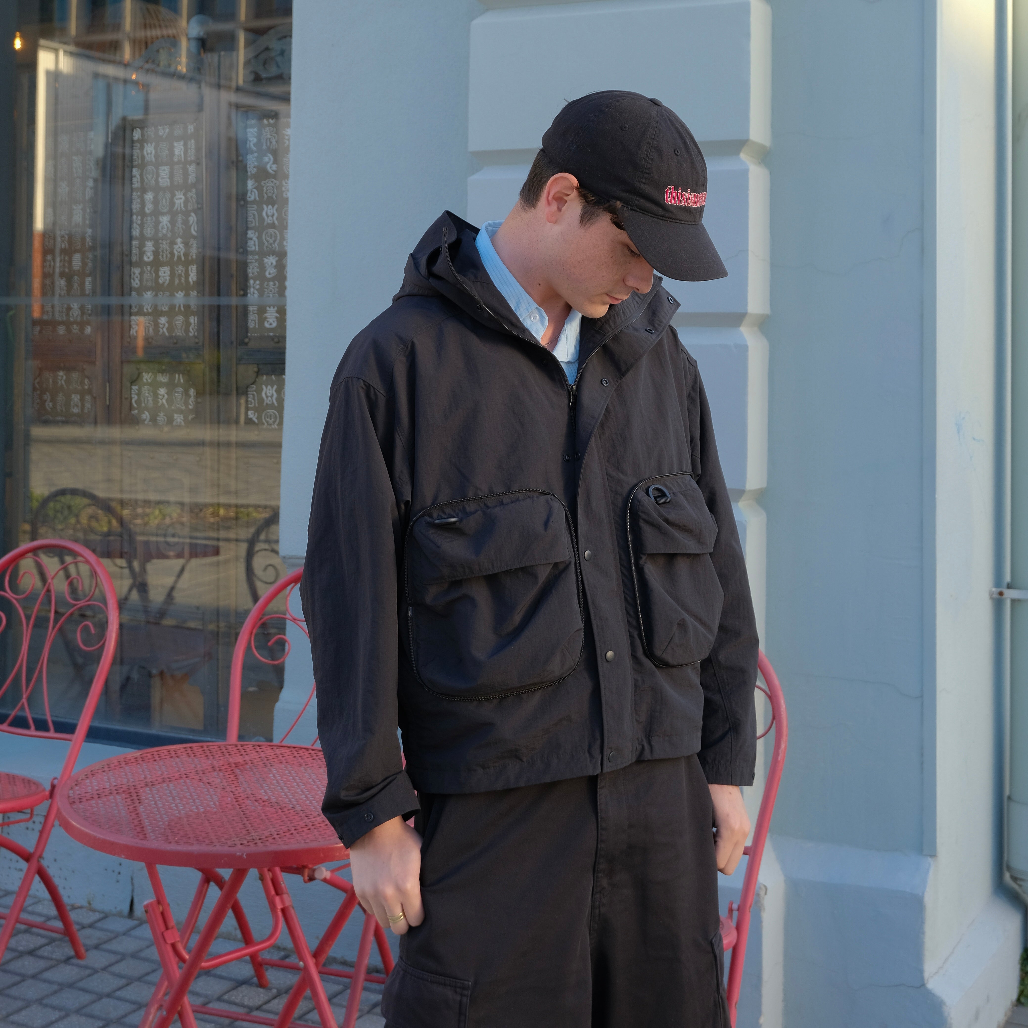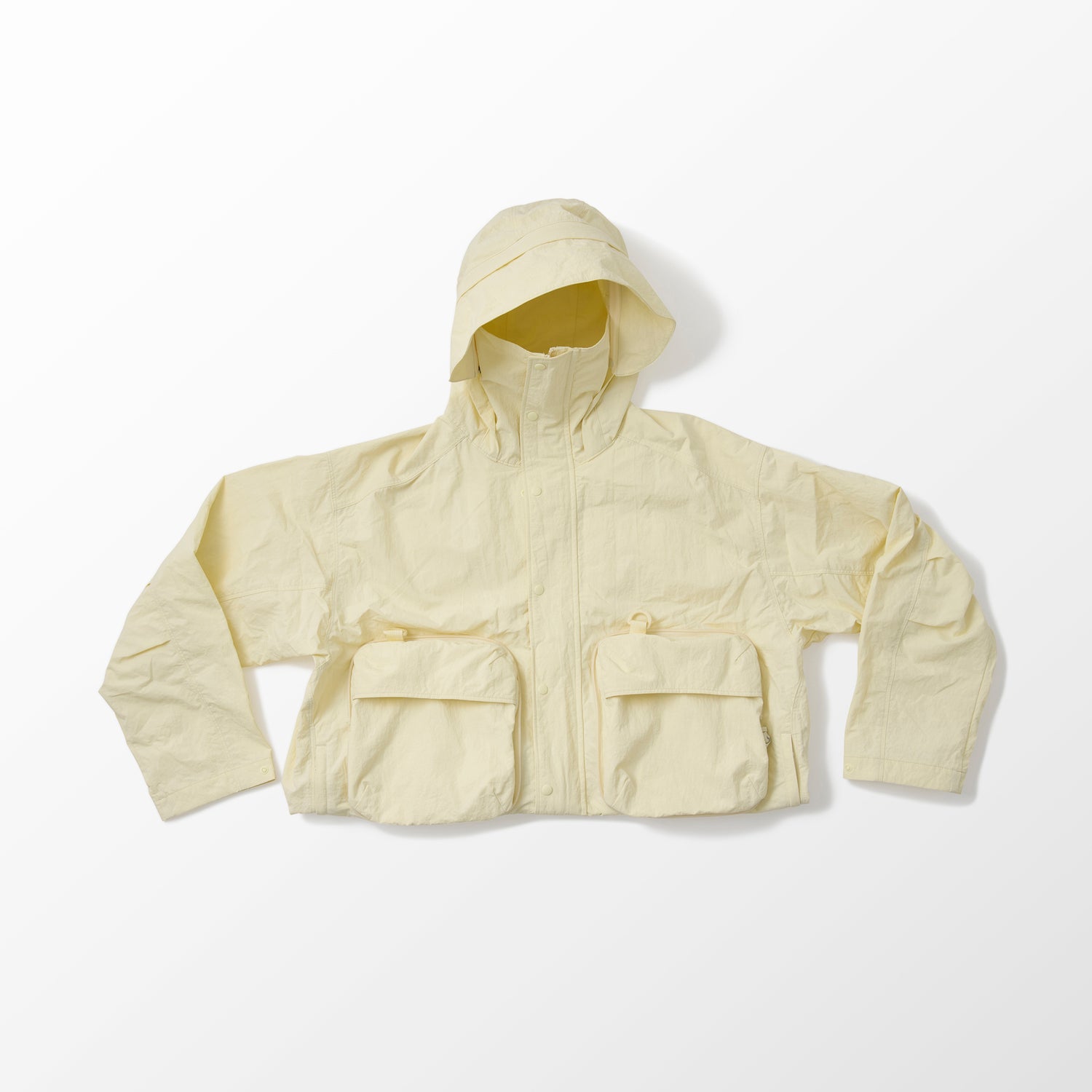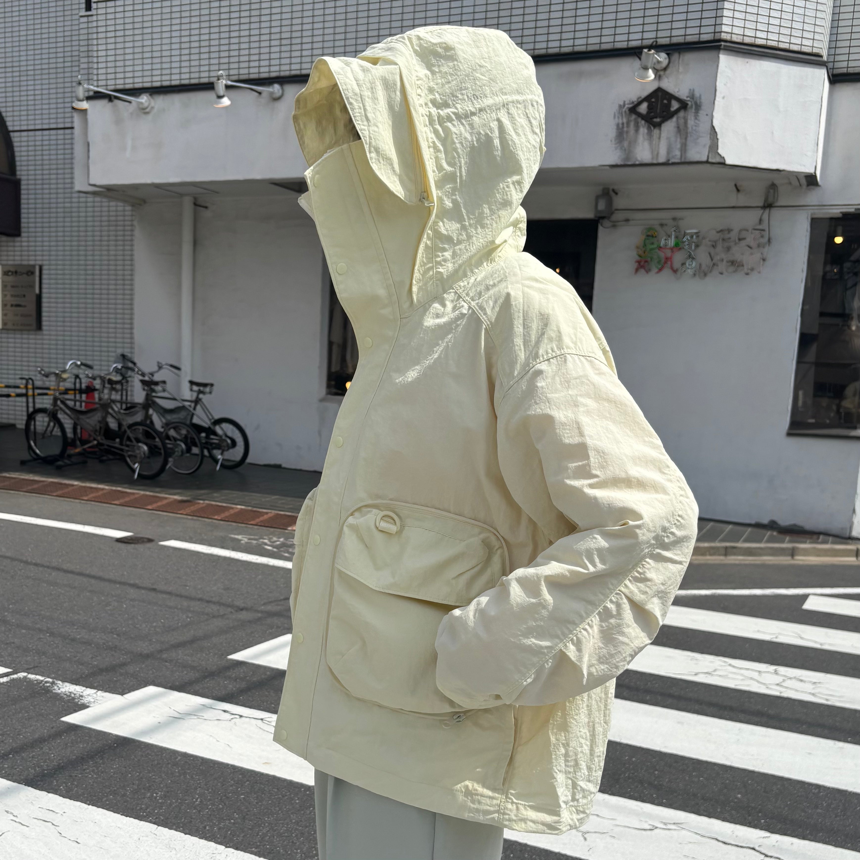 大きなポケットが4つもあり、脇ポケットにはジッパーが付いています。大切な物を入れて、ぐっすり寝てしまっても、紛失対策ばっちり。バック型に収納できるバッカブル仕様で、移動もらくらく。バックの紐は着用時には裏側の見頃ループに通せて、暑くなったら背負えるようなデザインです。急に天候が崩れても、多少なら雨なら防げる撥水素材を使用しています。いろいろな使い方ができる、旅の相棒に最高の一枚!