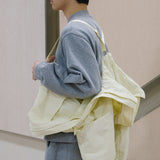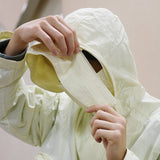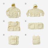 バックの紐は着用時には裏側の見頃ループに通せて、暑くなったら背負えるようなデザインです。