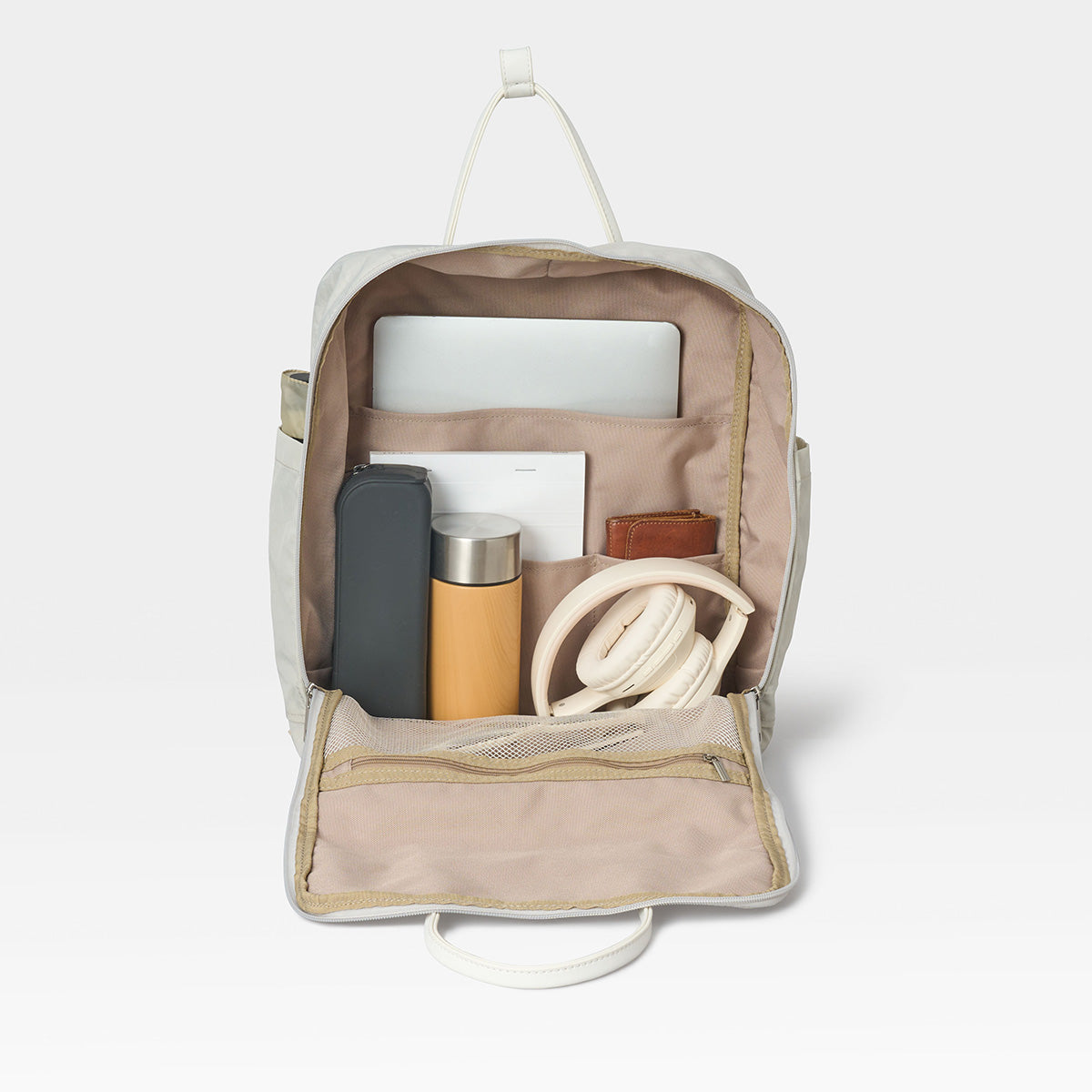15インチPCやタブレットなどその他のガジェットの収納ポケットに加え、ガバッと開くフロントポケットで、スマホや水筒も迷わずスマートに取り出せます。